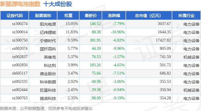 证券之星消息,10月10日,新能源电池(980027)指数报收于3346.13点,跌5.73%,成交907.74亿元,换手率3.66%。当日该指数成份股中,上涨的有9家,金盘科技以6.99%的涨幅领涨,下跌的有41家,上能电气以13.72%的跌幅领跌。