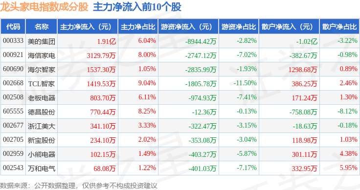 资金流向方面,龙头家电(980028)指数成份股当日主力资金净流出合计24.34亿元,游资资金净流入合计5.99亿元,散户资金净流入合计18.35亿元。成份股资金流向详情见下表: