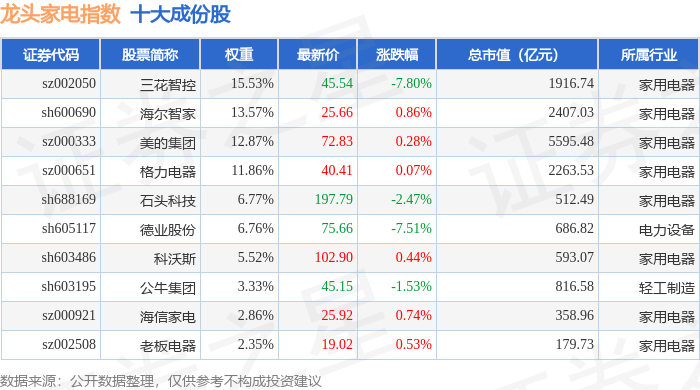 证券之星消息,10月10日,龙头家电(980028)指数报收于12363.5点,跌1.73%,成交264.51亿元,换手率1.73%。当日该指数成份股中,上涨的有22家,浙江美大以1.39%的涨幅领涨,下跌的有7家,三花智控以7.8%的跌幅领跌。