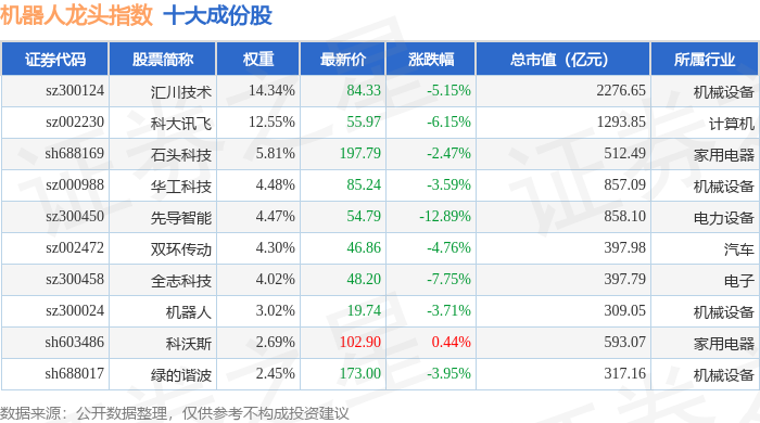 机器人龙头(980071)指数十大成份股详情如下: