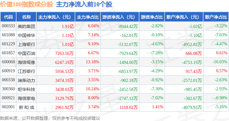 资金流向方面,价值100(980081)指数成份股当日主力资金净流出合计24.8亿元,游资资金净流入合计4.79亿元,散户资金净流入合计20.01亿元。成份股资金流向详情见下表: