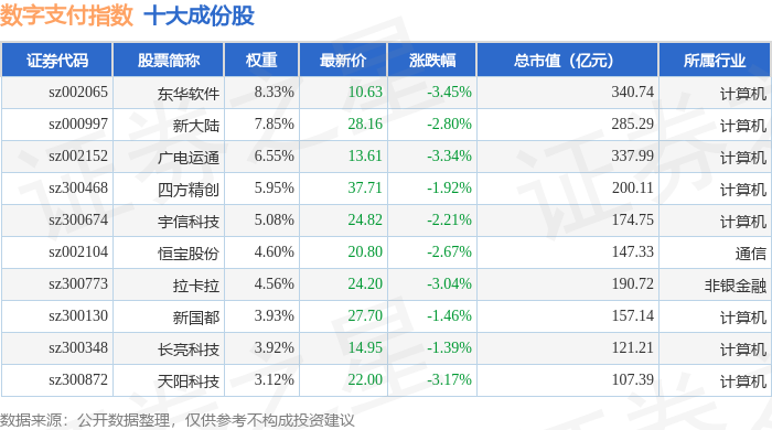 证券之星消息,10月10日,数字支付(980113)指数报收于1906.46点,跌2.55%,成交328.36亿元,换手率3.18%。当日该指数成份股中,上涨的有2家,先进数通以9.61%的涨幅领涨,下跌的有48家,国盾量子以9.72%的跌幅领跌。