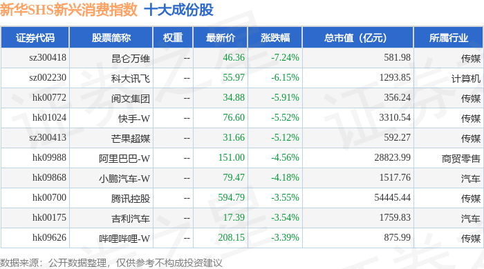 新华SHS新兴消费(989006)指数十大成份股详情如下:
