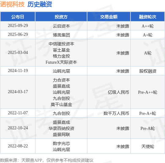 证券之星消息,根据天眼查APP于9月29日公布的信息整理,诺视科技(苏州)有限公司A++轮融资,融资额未披露,参与投资的机构包括云启资本。