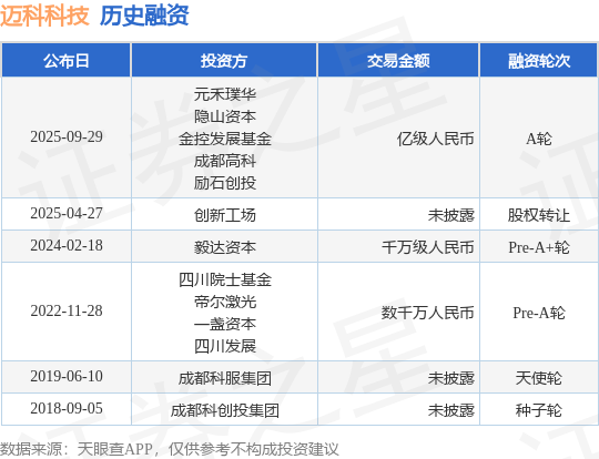 证券之星消息,根据天眼查APP于9月29日公布的信息整理,成都迈科科技有限公司A轮融资,融资额亿级人民币,参与投资的机构包括元禾璞华,隐山资本,金控发展基金,成都高科,励石创投。