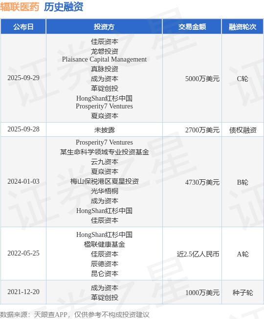 证券之星消息,根据天眼查APP于9月29日公布的信息整理,上海辐联医药科技有限公司C轮融资,融资额5000万美元,参与投资的机构包括佳辰资本,龙磐投资,Plaisance Capital Management,真脉投资,成为资本,革锭创投,HongShan红杉中国,Prosperity7 Ventures,夏焱资本。