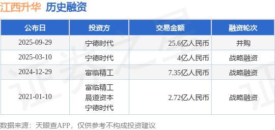 证券之星消息,根据天眼查APP于9月29日公布的信息整理,江西升华新材料有限公司并购融资,融资额25.6亿人民币,参与投资的机构包括宁德时代,投后估值79.36亿人民币。