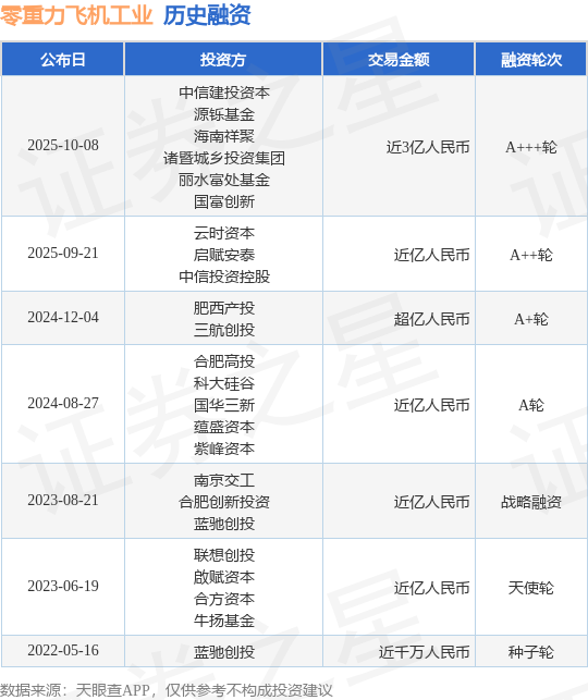 证券之星消息,根据天眼查APP于10月8日公布的信息整理,零重力飞机工业(合肥)有限公司A+++轮融资,融资额近3亿人民币,参与投资的机构包括中信建投资本,源铄基金,海南祥聚,诸暨城乡投资集团,丽水富处基金,国富创新。