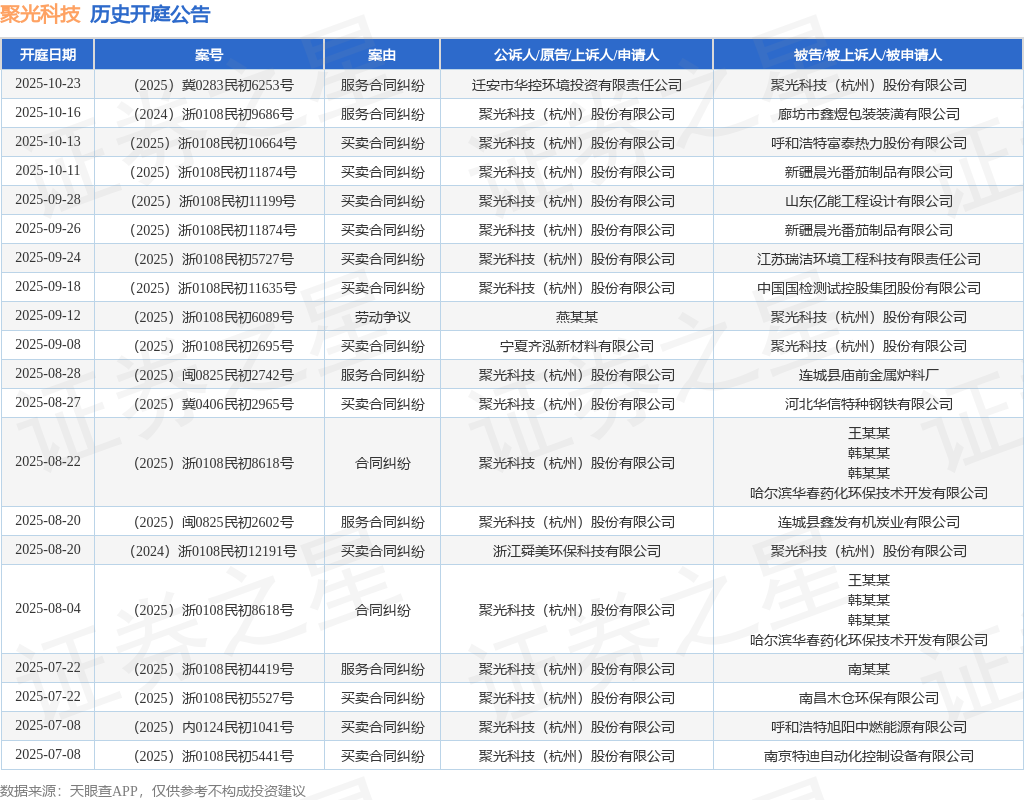 案号:(2025)浙0108民初10664号根据统计,近一年内以聚光科技(杭州)股份有限公司为当事人的历史开庭公告有52则,其中案由为“买卖合同纠纷”的公告以26则居首,其次为“服务合同纠纷”有18则,“合同纠纷”有5则。历史开庭公告(前20条)如下: