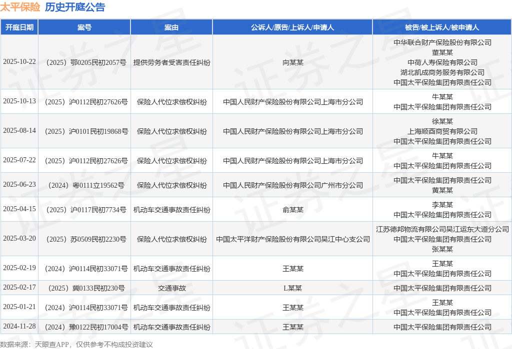 案号:(2025)沪0112民初27626号根据统计,近一年内以中国太平保险集团有限责任公司为当事人的历史开庭公告有11则,其中案由为“保险人代位求偿权纠纷”的公告以5则居首,其次为“机动车交通事故责任纠纷”有4则,“交通事故”有1则。历史开庭公告如下: