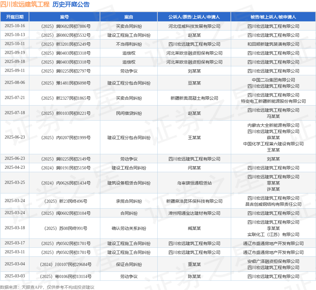 案号:(2025)浙0802民初5532号根据统计,近一年内以四川宏远建筑工程有限公司为当事人的历史开庭公告有46则,其中案由为“建筑设备租赁合同纠纷”的公告以7则居首,其次为“劳动争议”有5则,“买卖合同纠纷”有4则。历史开庭公告(前20条)如下: