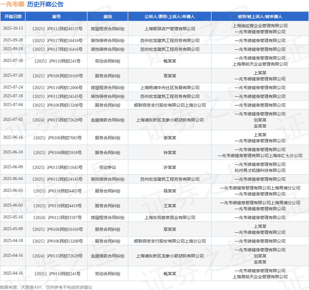 案号:(2025)沪0112民初49137号根据统计,近一年内以一兆韦德健身管理有限公司为当事人的历史开庭公告有68则,其中案由为“服务合同纠纷”的公告以24则居首,其次为“房屋租赁合同纠纷”有9则,“装饰装修合同纠纷”有8则。历史开庭公告(前20条)如下: