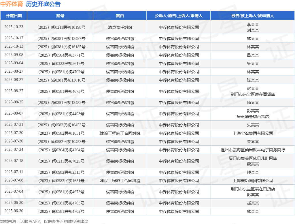 案号:(2025)浙0381民初16185号根据统计,近一年内以中乔体育股份有限公司为当事人的历史开庭公告有75则,其中案由为“侵害商标权纠纷”的公告以69则居首,其次为“侵害作品信息网络传播权纠纷”有2则,“建设工程施工合同纠纷”有2则。历史开庭公告(前20条)如下: