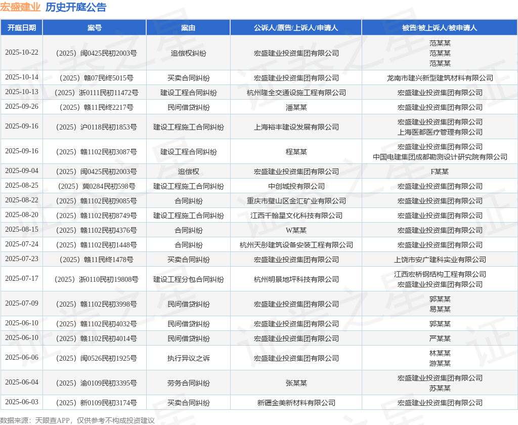 案号:(2025)浙0111民初11472号根据统计,近一年内以宏盛建业投资集团有限公司为当事人的历史开庭公告有102则,其中案由为“建设工程施工合同纠纷”的公告以19则居首,其次为“建设工程合同纠纷”有16则,“买卖合同纠纷”有14则。历史开庭公告(前20条)如下: