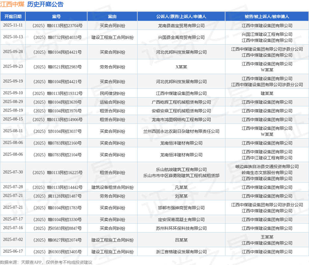 案号:(2025)赣0732民初4033号根据统计,近一年内以江西中煤建设集团有限公司为当事人的历史开庭公告有109则,其中案由为“买卖合同纠纷”的公告以46则居首,其次为“建设工程施工合同纠纷”有16则,“租赁合同纠纷”有7则。历史开庭公告(前20条)如下: