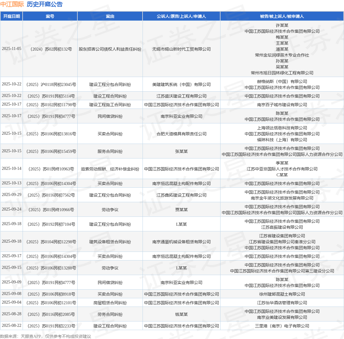 案号:(2025)苏0106民初14304号根据统计,近一年内以中国江苏国际经济技术合作集团有限公司为当事人的历史开庭公告有177则,其中案由为“买卖合同纠纷”的公告以40则居首,其次为“建设工程合同纠纷”有29则,“建设工程分包合同纠纷”有24则。历史开庭公告(前20条)如下: