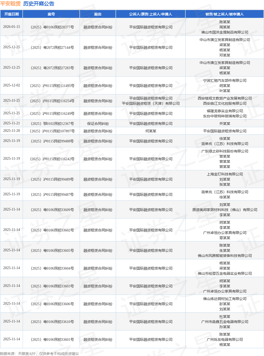 案号:(2025)浙0205民初7867号根据统计,近一年内以平安国际融资租赁有限公司为当事人的历史开庭公告有1167则,其中案由为“融资租赁合同纠纷”的公告以1110则居首,其次为“买卖合同纠纷”有10则,“合同纠纷”有9则。历史开庭公告(前20条)如下: