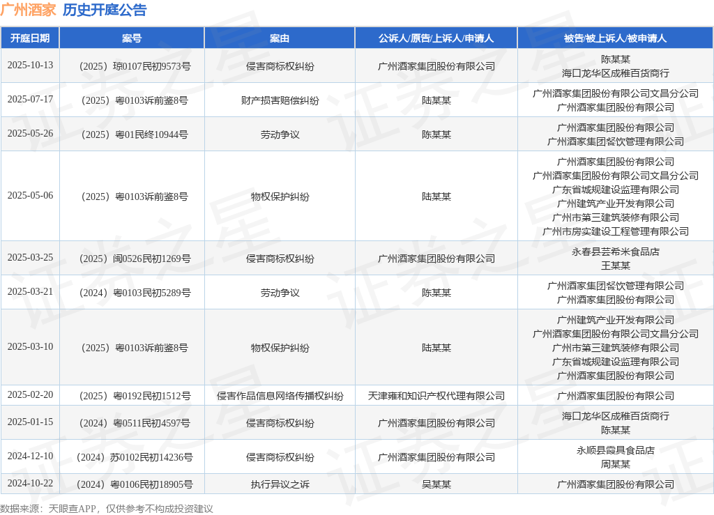 案号:(2025)琼0107民初9573号根据统计,近一年内以广州酒家集团股份有限公司为当事人的历史开庭公告有11则,其中案由为“侵害商标权纠纷”的公告以4则居首,其次为“劳动争议”有2则,“物权保护纠纷”有2则。历史开庭公告如下: