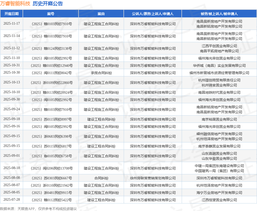 案号:(2025)浙0109民初22866号根据统计,近一年内以深圳市万睿智能科技有限公司为当事人的历史开庭公告有76则,其中案由为“建设工程施工合同纠纷”的公告以48则居首,其次为“建设工程合同纠纷”有10则,“买卖合同纠纷”有6则。历史开庭公告(前20条)如下: