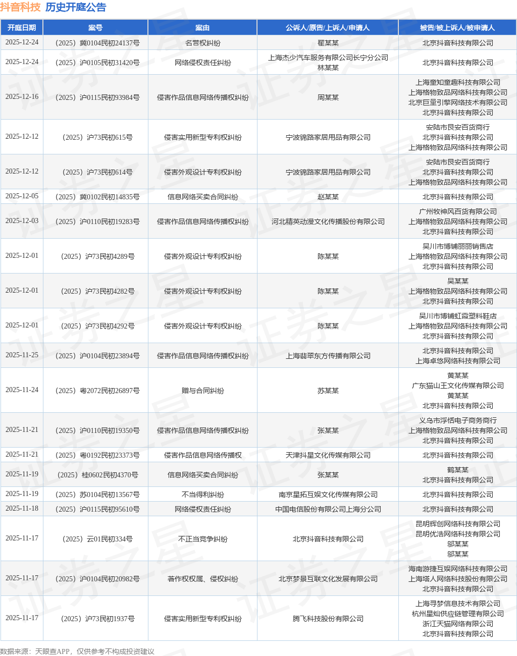 案号:(2025)鄂0103民初2556号根据统计,近一年内以北京抖音科技有限公司为当事人的历史开庭公告有1633则,其中案由为“侵害外观设计专利权纠纷”的公告以198则居首,其次为“名誉权纠纷”有174则,“侵害作品信息网络传播权纠纷”有167则。历史开庭公告(前20条)如下: