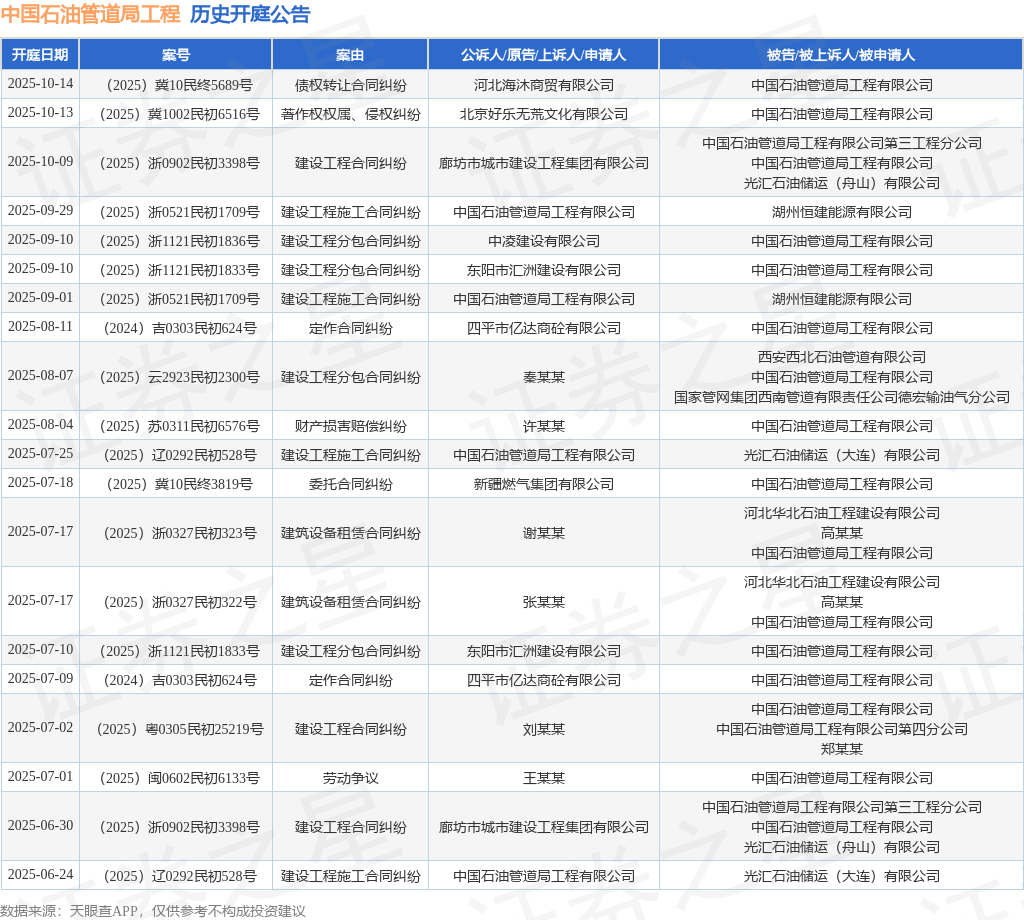 案号:(2025)冀1002民初6516号根据统计,近一年内以中国石油管道局工程有限公司为当事人的历史开庭公告有44则,其中案由为“建设工程施工合同纠纷”的公告以10则居首,其次为“建设工程分包合同纠纷”有6则,“建筑设备租赁合同纠纷”有5则。历史开庭公告(前20条)如下: