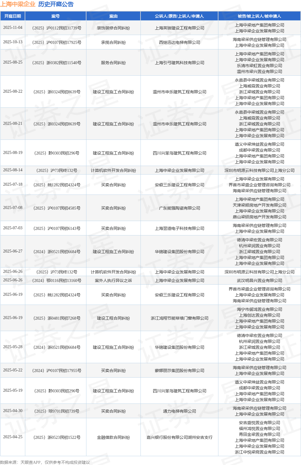 案号:(2025)沪0107民初17925号根据统计,近一年内以上海中梁企业发展有限公司为当事人的历史开庭公告有36则,其中案由为“买卖合同纠纷”的公告以12则居首,其次为“建设工程施工合同纠纷”有9则,“计算机软件开发合同纠纷”有4则。历史开庭公告(前20条)如下: