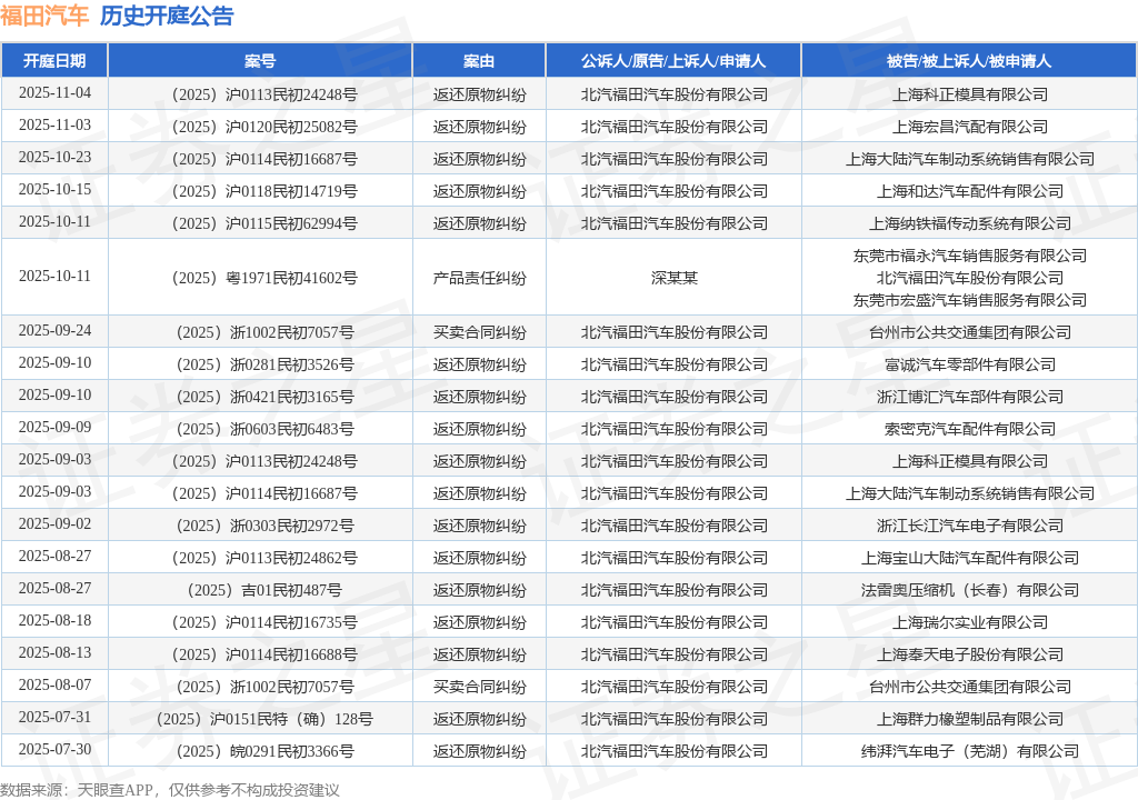 案号:(2025)沪0118民初14719号根据统计,近一年内以北汽福田汽车股份有限公司为当事人的历史开庭公告有69则,其中案由为“返还原物纠纷”的公告以46则居首,其次为“买卖合同纠纷”有10则,“产品责任纠纷”有4则。历史开庭公告(前20条)如下: