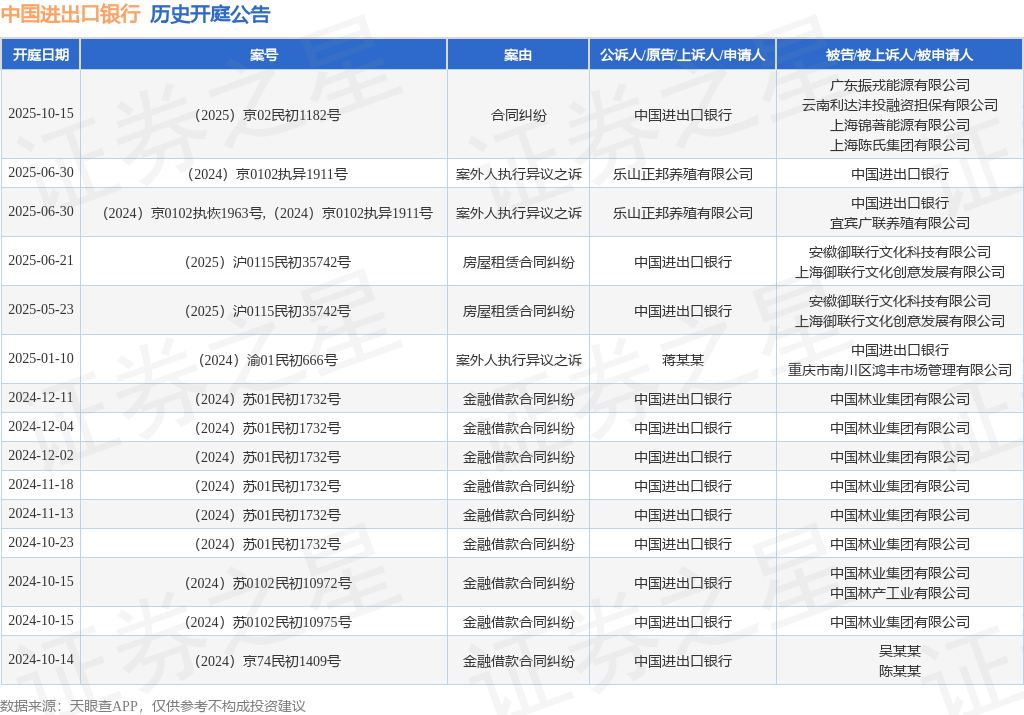 根据统计,近一年内以中国进出口银行为当事人的历史开庭公告有15则,其中案由为“金融借款合同纠纷”的公告以9则居首,其次为“案外人执行异议之诉”有3则,“房屋租赁合同纠纷”有2则。历史开庭公告如下: