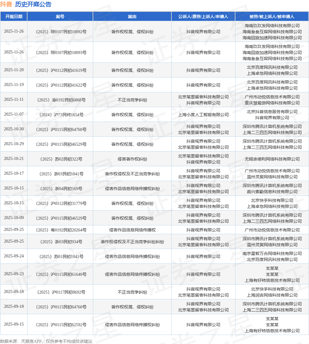 案号:(2025)浙04民初169号根据统计,近一年内以抖音视界有限公司为当事人的历史开庭公告有118则,其中案由为“著作权权属、侵权纠纷”的公告以41则居首,其次为“侵害作品信息网络传播权纠纷”有39则,“不正当竞争纠纷”有10则。历史开庭公告(前20条)如下: