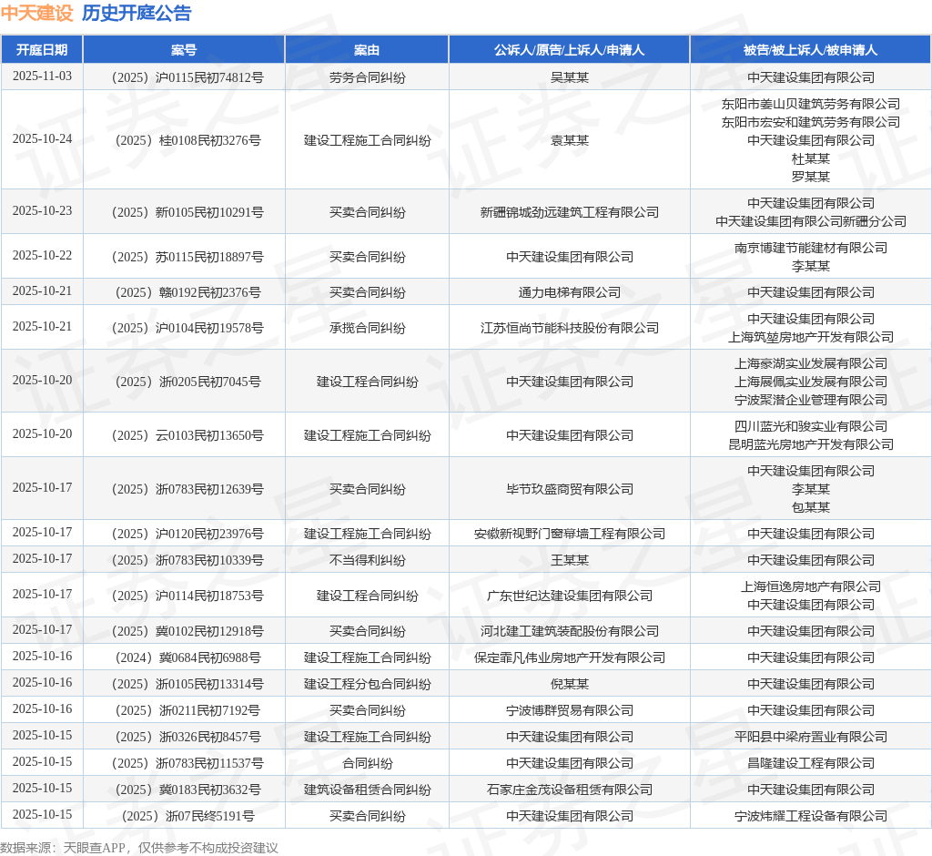 案号:(2025)浙0783民初11537号根据统计,近一年内以中天建设集团有限公司为当事人的历史开庭公告有1691则,其中案由为“买卖合同纠纷”的公告以531则居首,其次为“建设工程施工合同纠纷”有259则,“建设工程分包合同纠纷”有178则。历史开庭公告(前20条)如下: