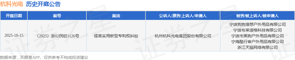 证券之星消息,根据天眼查APP显示,近日公布了一则杭州杭科光电集团股份有限公司作为原告/上诉人的开庭公告,详细内容如下:
