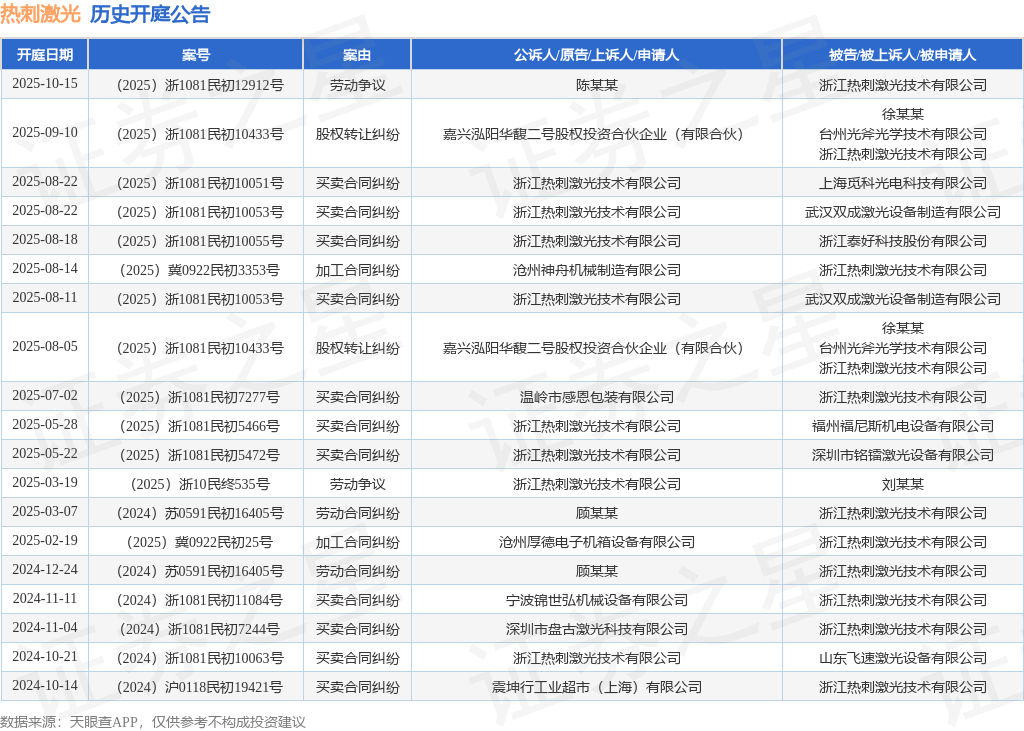 案号:(2025)浙1081民初12912号根据统计,近一年内以浙江热刺激光技术有限公司为当事人的历史开庭公告有19则,其中案由为“买卖合同纠纷”的公告以11则居首,其次为“加工合同纠纷”有2则,“劳动争议”有2则。历史开庭公告如下: