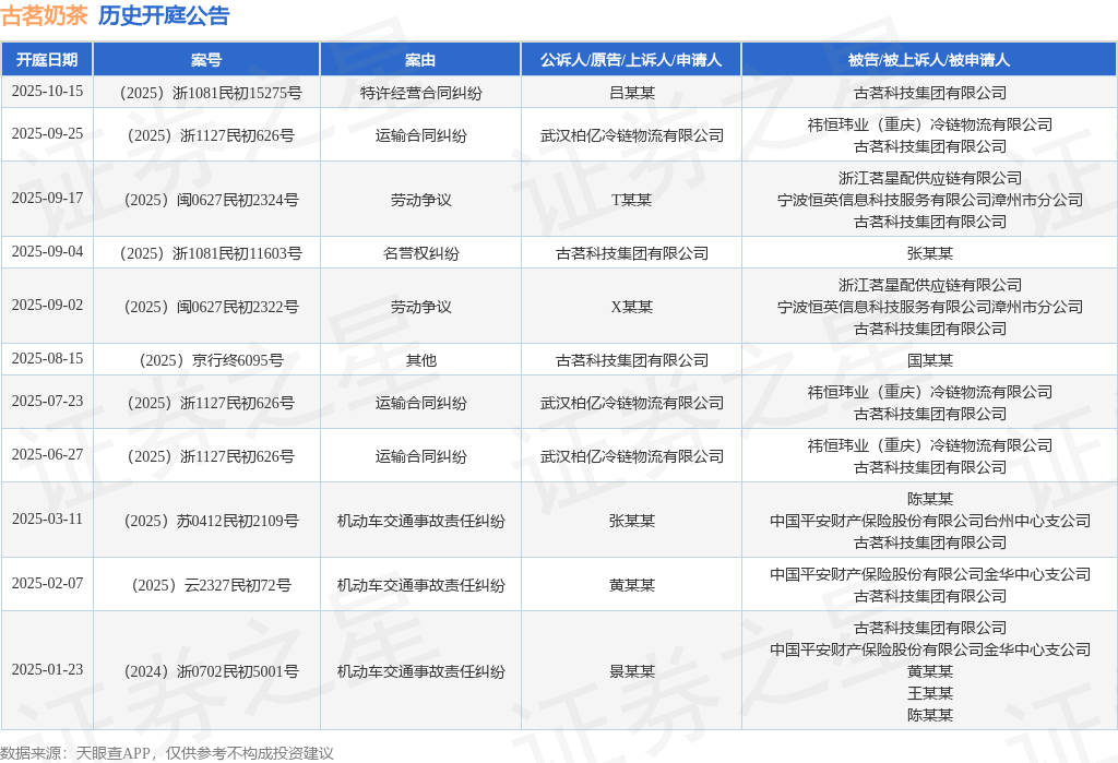 案号:(2025)浙1081民初15275号根据统计,近一年内以古茗科技集团有限公司为当事人的历史开庭公告有11则,其中案由为“机动车交通事故责任纠纷”的公告以3则居首,其次为“运输合同纠纷”有3则,“劳动争议”有2则。历史开庭公告如下:
