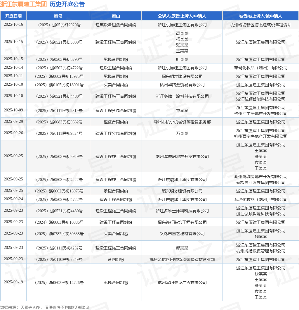 案号:(2025)浙0521民初6889号根据统计,近一年内以浙江东厦建工集团有限公司为当事人的历史开庭公告有123则,其中案由为“买卖合同纠纷”的公告以25则居首,其次为“建设工程施工合同纠纷”有22则,“合同纠纷”有14则。历史开庭公告(前20条)如下: