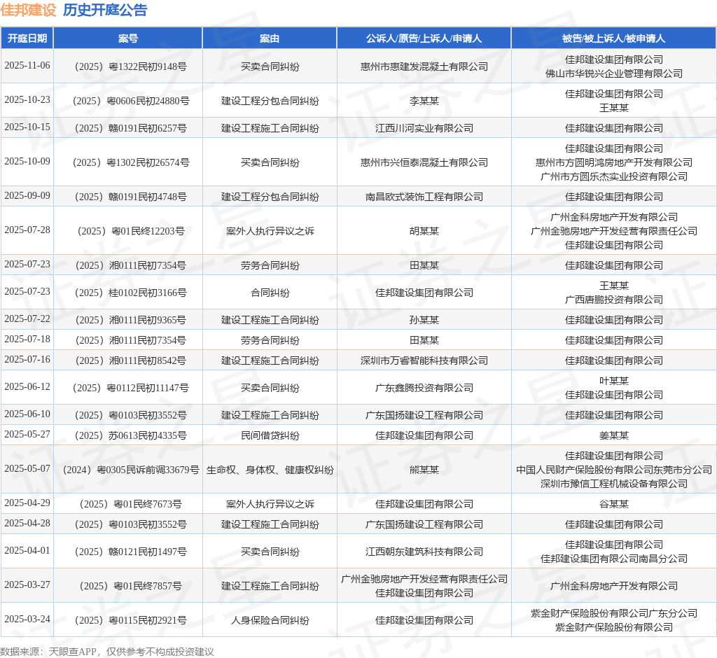 案号:(2025)赣0191民初6257号根据统计,近一年内以佳邦建设集团有限公司为当事人的历史开庭公告有38则,其中案由为“人身保险合同纠纷”的公告以10则居首,其次为“建设工程施工合同纠纷”有8则,“买卖合同纠纷”有6则。历史开庭公告(前20条)如下:
