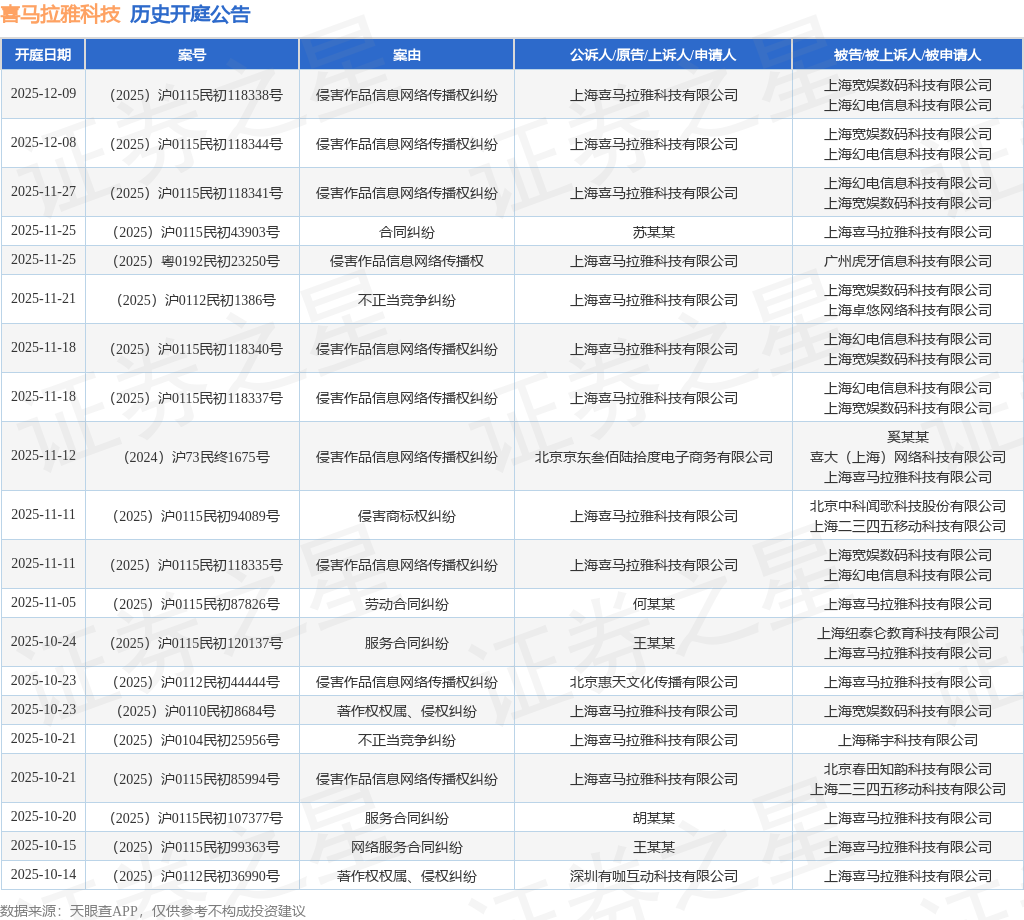 案号:(2025)沪0115民初99363号根据统计,近一年内以上海喜马拉雅科技有限公司为当事人的历史开庭公告有208则,其中案由为“侵害作品信息网络传播权纠纷”的公告以77则居首,其次为“著作权权属、侵权纠纷”有68则,“服务合同纠纷”有17则。历史开庭公告(前20条)如下: