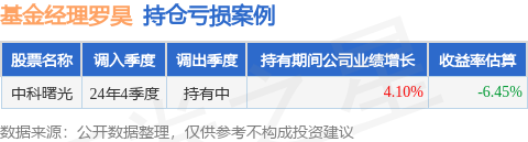 罗昊管理的汇添富中证信息技术应用创新产业ETF基金在24年4季度买入中科曙光,已连续持有3个季度。持有期间的估算收益率为-6.45%,持有期间中科曙光在2023年到2024年的年报归属净利润增幅达4.1%。
