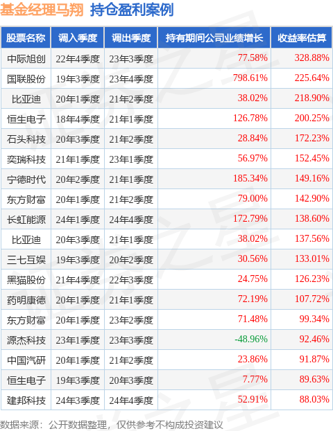 马翔管理的汇添富创新增长一年定开混合A基金在22年4季度买入中际旭创,在持有3个季度后在23年3季度卖出。持有期间的估算收益率为328.88%,持有期间中际旭创在2022年到2023年的年报归属净利润增幅达77.58%。