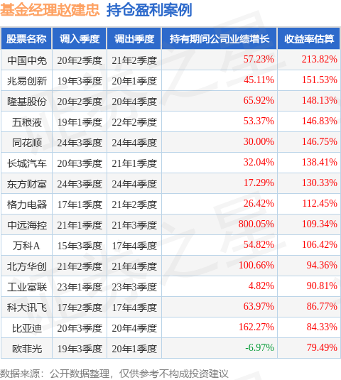 赵建忠管理的沪深300等权LOF基金在21年2季度买入北方华创,在持有2个季度后在21年4季度卖出。持有期间的估算收益率为94.36%,持有期间北方华创在2020年到2021年的年报归属净利润增幅达100.66%。