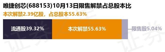 证券之星消息,根据市场公开信息整理,唯捷创芯(688153)于10月13日将有2.39亿股限售股份解禁,为公司追加承诺限售股份上市流通,占公司总股本55.63%。(本次数据根据历史公告整理得出,实际情况以上市公司最新公告为准)最近一年内,该股累计解禁5545.43万股,占总股本的12.89%。本次解禁后,公司还有2169.36万股限售股份,占总股本5.04%。具体如下图所示: