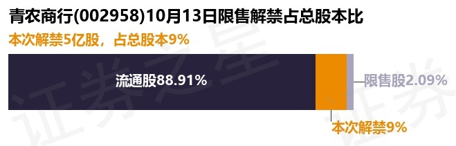 证券之星消息,根据市场公开信息整理,青农商行(002958)于10月13日将有5.0亿股限售股份解禁,为公司首发原股东限售股份,占公司总股本9.0%。(本次数据根据历史公告整理得出,实际情况以上市公司最新公告为准)最近一年内,该股累计解禁1224.15万股,占总股本的0.22%。本次解禁后,公司还有1.16亿股限售股份,占总股本2.09%。具体如下图所示:
