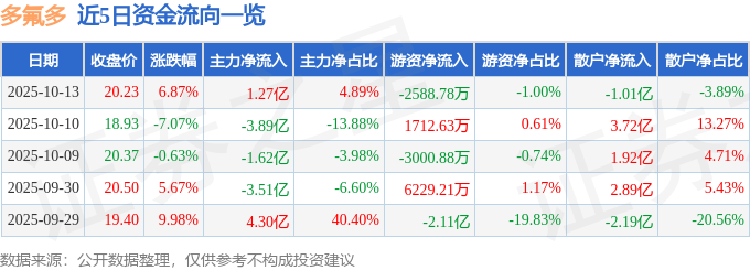 10月13日的资金流向数据方面,主力资金净流入1.27亿元,占总成交额4.89%,游资资金净流出2588.78万元,占总成交额1.0%,散户资金净流出1.01亿元,占总成交额3.89%。