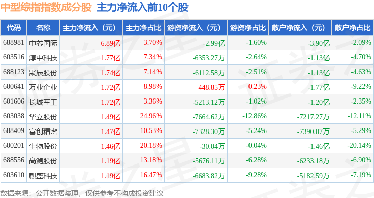 资金流向方面,中型综指(000020)指数成份股当日主力资金净流出合计32.05亿元,游资资金净流出合计4.58亿元,散户资金净流入合计36.63亿元。成份股资金流向详情见下表: