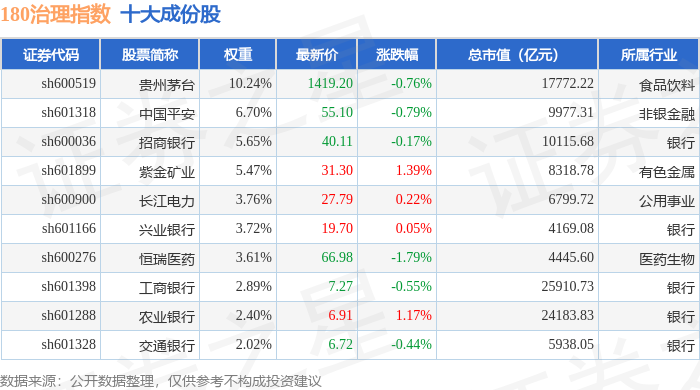 证券之星消息,10月13日,180治理(000021)指数报收于1052.75点,跌0.35%,成交1498.17亿元,换手率0.49%。当日该指数成份股中,上涨的有33家,中金黄金以8.05%的涨幅领涨,下跌的有64家,石头科技以5.2%的跌幅领跌。