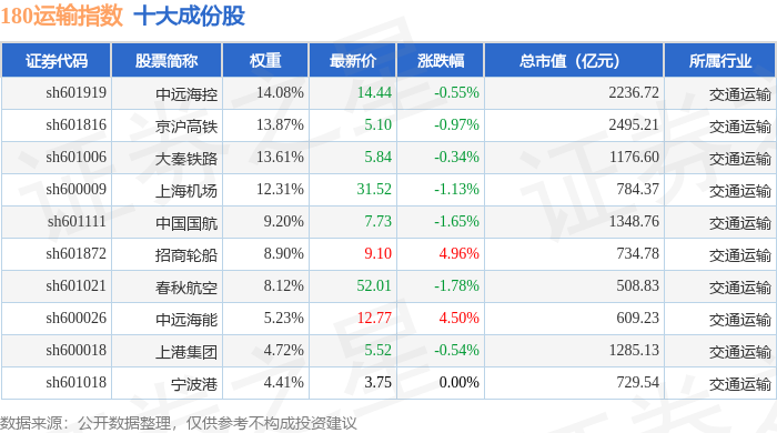 证券之星消息,10月13日,180运输(000027)指数报收于760.02点,跌0.02%,成交79.26亿元,换手率0.57%。当日该指数成份股中,上涨的有4家,招商轮船以4.96%的涨幅领涨,下跌的有8家,春秋航空以1.78%的跌幅领跌。