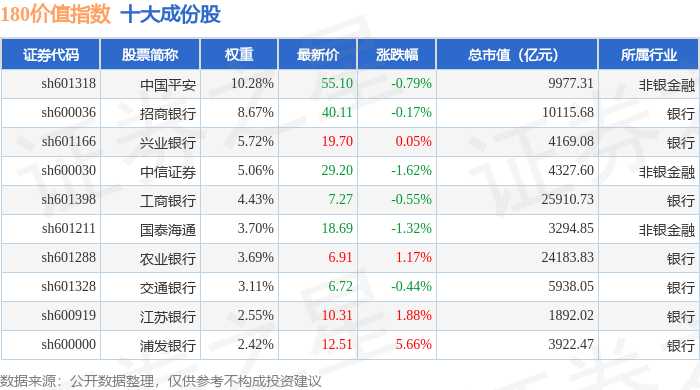 证券之星消息,10月13日,180价值(000029)指数报收于4214.59点,跌0.07%,成交905.44亿元,换手率0.51%。当日该指数成份股中,上涨的有20家,浦发银行以5.66%的涨幅领涨,下跌的有36家,华域汽车以3.46%的跌幅领跌。