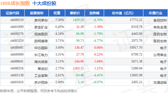 证券之星消息,10月13日,180R成长(000030)指数报收于2641.08点,涨0.0%,成交3136.03亿元,换手率1.31%。当日该指数成份股中,上涨的有47家,沪硅产业以10.83%的涨幅领涨,下跌的有81家,石头科技以5.2%的跌幅领跌。