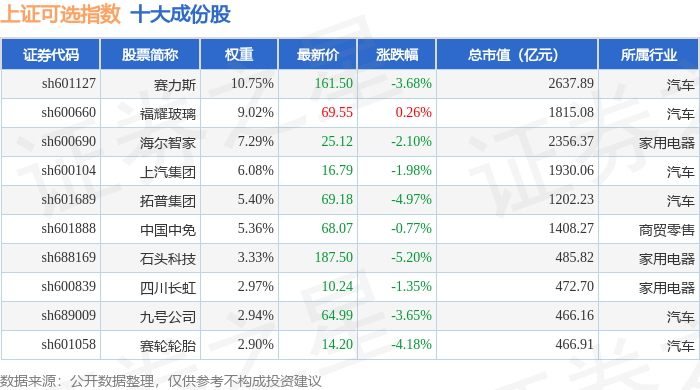 证券之星消息,10月13日,上证可选(000035)指数报收于3061.75点,跌2.4%,成交392.27亿元,换手率1.49%。当日该指数成份股中,上涨的有8家,隆鑫通用以6.12%的涨幅领涨,下跌的有42家,新泉股份以7.12%的跌幅领跌。