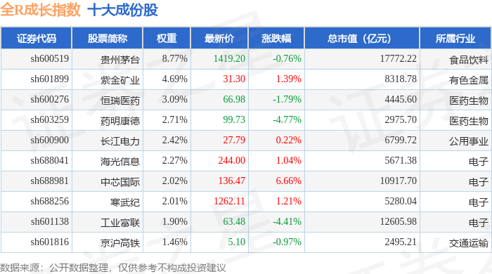 证券之星消息,10月13日,全R成长(000059)指数报收于3414.7点,跌0.15%,成交5382.44亿元,换手率1.97%。当日该指数成份股中,上涨的有129家,华虹公司以20.0%的涨幅领涨,下跌的有244家,浙江鼎力以7.71%的跌幅领跌。