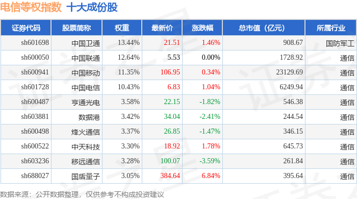 证券之星消息,10月13日,电信等权(000078)指数报收于3295.82点,跌0.05%,成交214.64亿元,换手率0.92%。当日该指数成份股中,上涨的有6家,国盾量子以6.84%的涨幅领涨,下跌的有23家,移远通信以3.59%的跌幅领跌。